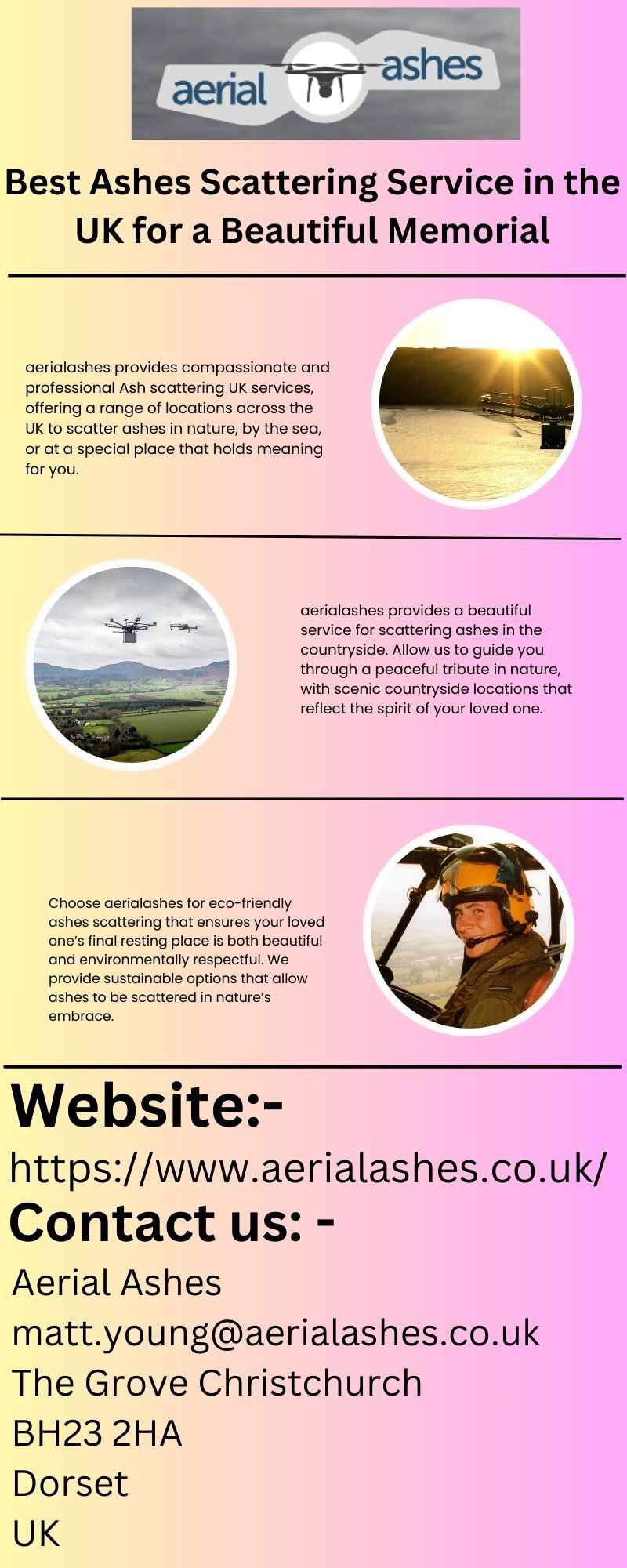For a sustainable and peaceful tribute, aerialashes offers an Eco-friendly cremation ashes service. We provide environmentally conscious options for scattering or interring ashes, ensuring your loved one's final journey respects nature.